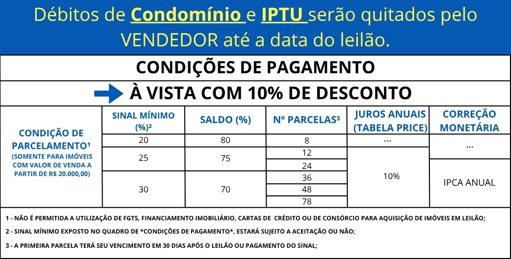 - Eventual regularização de confrontações, áreas de terreno e edificada, bem como de logradouro e numeração perante os órgãos públicos competentes, incluindo, mas não se limitando à Prefeitura Municipal e ao Cartório de Registro de Imóveis, será de responsabilidade do ARREMATANTE, que assumirá todos os encargos, providências e tributos eventualmente exigidos, inclusive aqueles cobrados de forma retroativa.